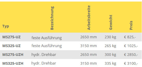 - Typ MS-275/325-UZH ist durch zwei doppeltwirkendem hydraulische Zylindern nach links und rechts bis max. 41º einzustellen und ist mit einstellbaren Enden versehen