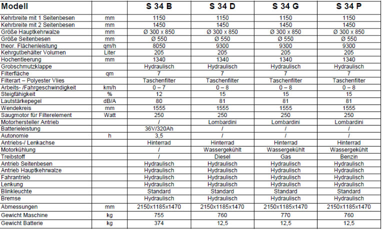 Mit den S 34 Modellen baut Fiorentini Industrie Kehrmaschinen für den professionellen Einsatz. Speziell in den Schwerindustriellen Bereichen, Bahnhöfen, Flughäfen und in Betrieben werden diese Maschinen eingesetzt. Dank Ihrem Direktkehrprinzip arbeiten die Maschinen besonders effizient und kostengünstig.