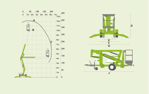 Durch Nutzung des vielseitigen teleskopischen oberen Arms bietet die Nifty 120T Anhängerbühnen einen unvergleichlichen Arbeitsbereich insbesondere im unteren Arbeitsbereich, wo dies am häufigsten erforderlich ist.