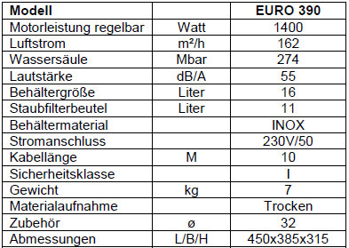 Der Kesselsauger EURO 390 ist ein Profisauger, ideal für Büro, Schule oder kleinere Werkstattbereiche.