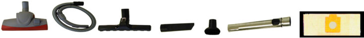 Bodendüse umschaltbar, flexibler Saugschlauch mit Handgriff, Bodendüse starr, Fugendüse, Rundbürste, Teleskop Stahlsaugrohr, Dauerfiltertüte Textil.