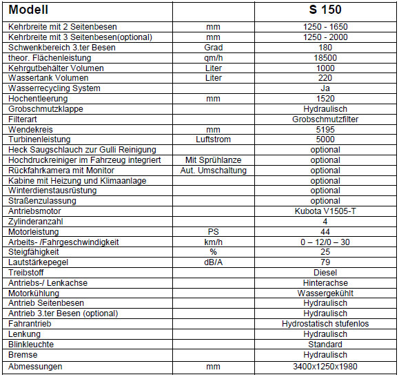 Aufgrund ihrer leistungsstarken Saugturbine erreicht die S 150 beste Arbeitsergebnisse. Mit dem optionalen dritten Besen können auch kleinste Ecken mit ausgekehrt werden oder die Flächenleistung wird deutlich erhöht.